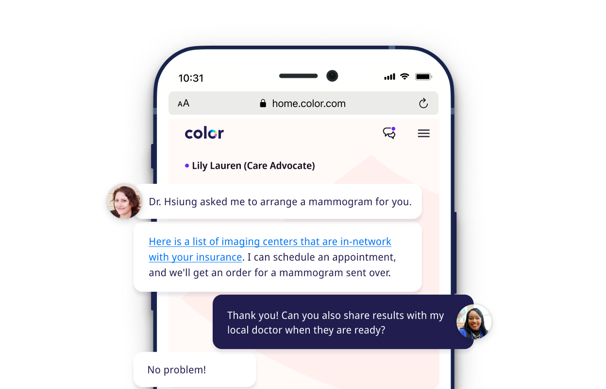 Looking for immediate assistance? Call us toll-free between 6am and 5pm Pacific Time at (844) 352-6567. Those outside the US can reach us at +1 650-651-7116. We’re also available via email at patients@color.com.