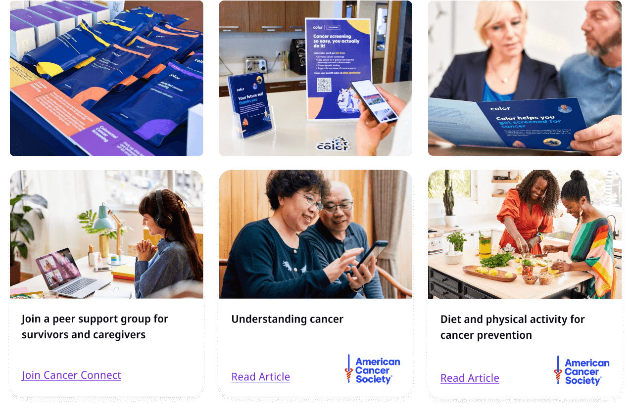 Together, Color and the American Cancer Society have designed one of the first Cancer Prevention and Screening Programs through which employers and unions can provide highly accessible screening solutions, connection to clinical services, high-touch care advocacy, and resources for further education, in partnership with existing care providers.
