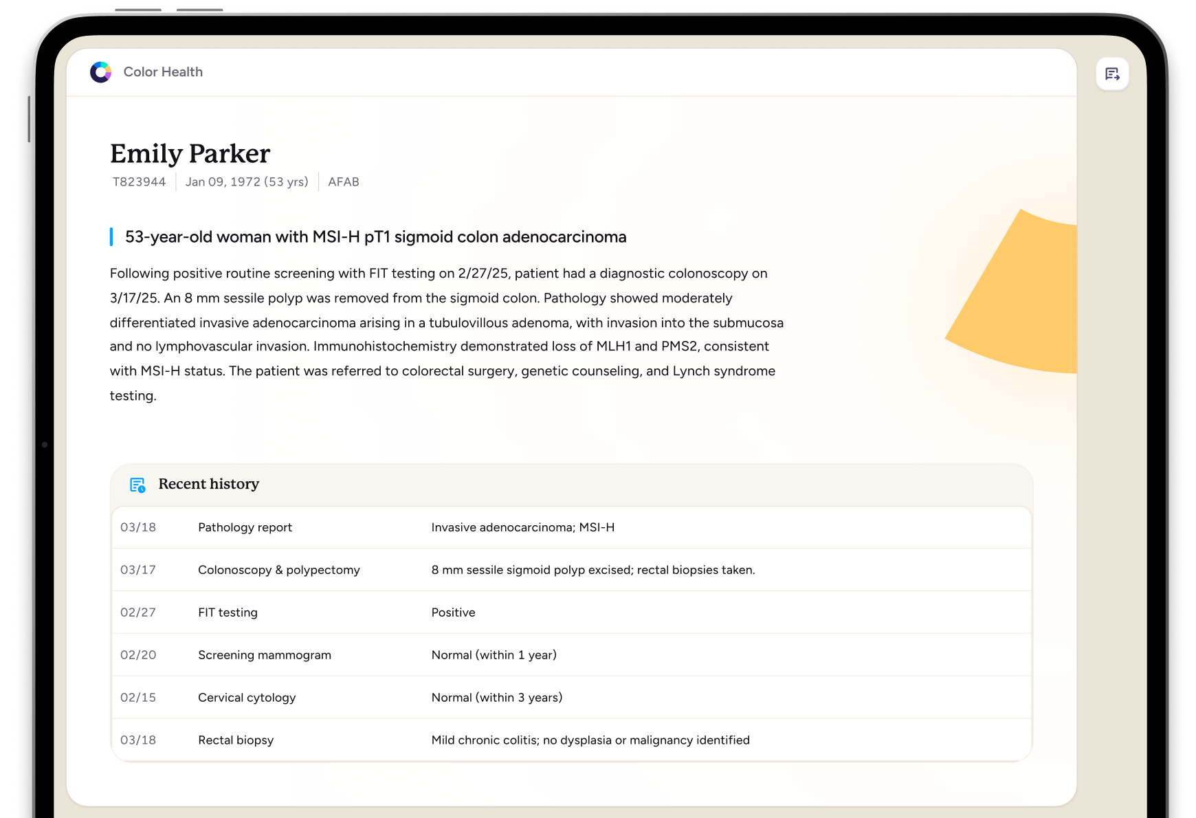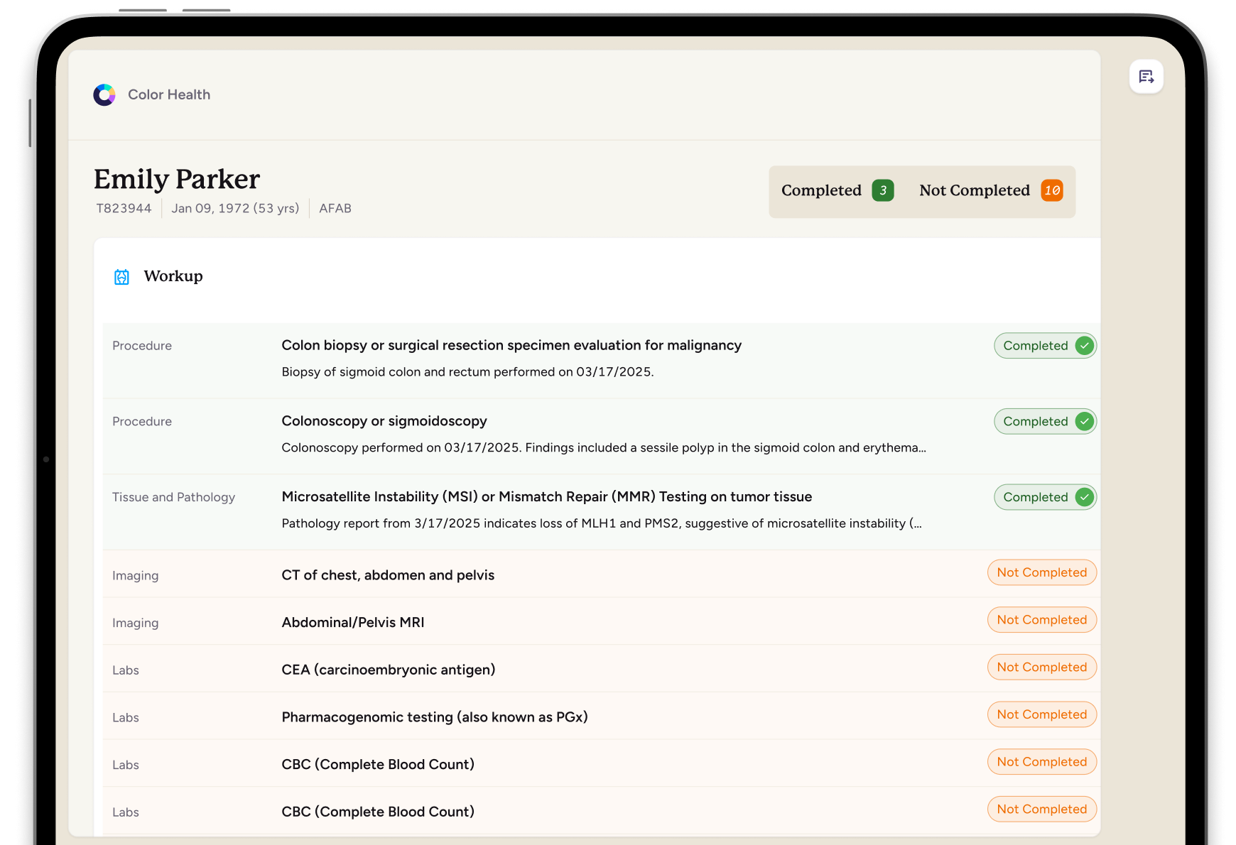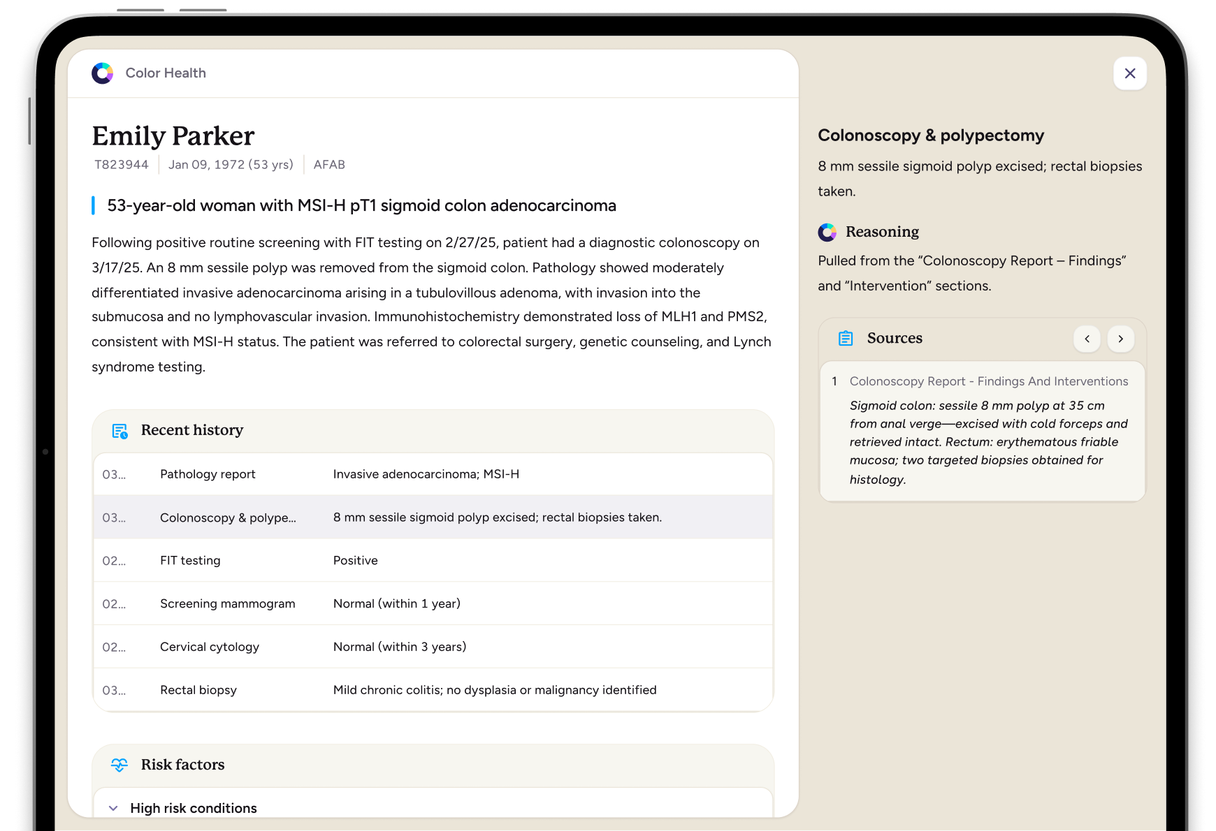 Where speed matters in cancer care, so does accuracy and expertise. At Color, our AI initiatives are built to inform patient care directly – which means our clinicians drive all decision-making. AI helps them scale to serve more patients, broaden their expertise in and beyond their core domain field, and consider the holistic needs of patients in their decisions.